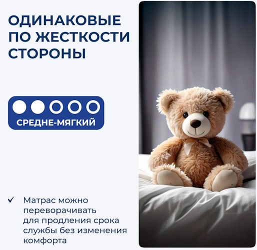 Жесткость изделия относится к классу «средняя». Высота составляет 15 см. Допустимый вес ребенка – 50 кг. Чехол мягкий, приятный к телу. Выполнен с антибактериальной обработкой. Стежка – терморегулируемый холлофайбер. Преимуществом так же является гипоаллергенность материала. Матрас Вилли – безупречная поддержка детского растущего организма, комфорт и надежность!