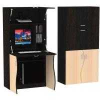 Один из плюсов - продуманная до мелочей конструкция и экономия места. Последнее особенно актуально для малогабаритных квартир. С виду СК-49 напоминает небольшой шкаф. но скрывается в нём полноценное рабочее место. Так, нижние дверцы становятся опорой для столешницы. Она, в свою очередь, трансформировалась в рабочую поверхность или подставку под клавиатуру из верхней дверцы. Удерживают двери в закрытом состоянии газовые механизмы. Также предусмотрена ниша для монитора, а в нижней части стола имеется открытая ниша для системного блока и горизонтальная полка для документов. Правая часть стола-трансформера снабжена 3-мя открытыми полками. В верхней части - открытая полка для оргтехники.